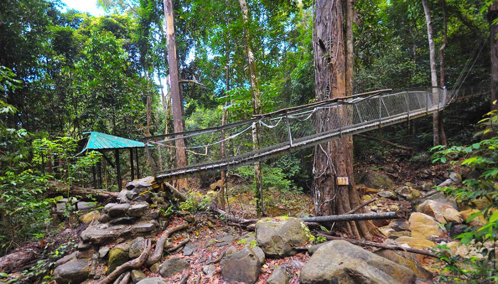 Upon trekking back to the Bukit Puteri Junction, if time permits, trekkers may make a sweet detour to the Red/Blue Jungle Trek trail to find a jungle gem. From the junction, one will encounter a trail of jungle roots and large rocks along the way before reaching a suspension bridge. A duration of one hour may be required for this endeavour. Crossing the bridge will lead you to the Permai Rainforest through the Jungle Trek trail. A right detour immediately before this bridge will lead you to a whole new adventure altogether. A dynamic change from the obnoxious and challenging mountain trail, this waterfall trail offers you a refreshing rocks-in-water trail. Don’t worry too much about stamina at this point as it is basically a flat route. A good pair of sneaker with powerful grip is essential though. The locally available rubber bowling shoes or widely known as ‘Adidas Kampung’ would do the trick.