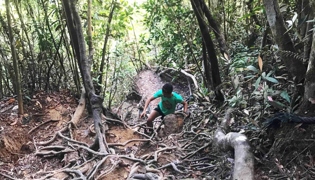 You are required to register your name at the Santubong National Park entrance before proceeding to the mountain trek (red colour coded). There are 3 trails in total; the red trail which is the mountain trek, the blue trail or the waterfall trail and the red/blue trail which is the jungle trail. Make sure you stay vigilant throughout the trek as the rocky and root-filled trail may distract your attention from the navigation provided. Faithfully trailing the red-coded trail for approximately 1-1.5 hours will lead you to the F7 check point named Bukit Puteri. Here, you may get a panoramic view of Kampung Santubong, the golf course and coastal view of nearby beaches. Many hikers will take a short break here before heading up as it gets technical beyond this point.